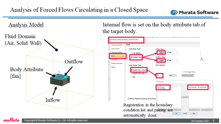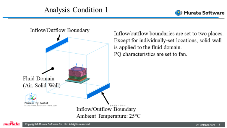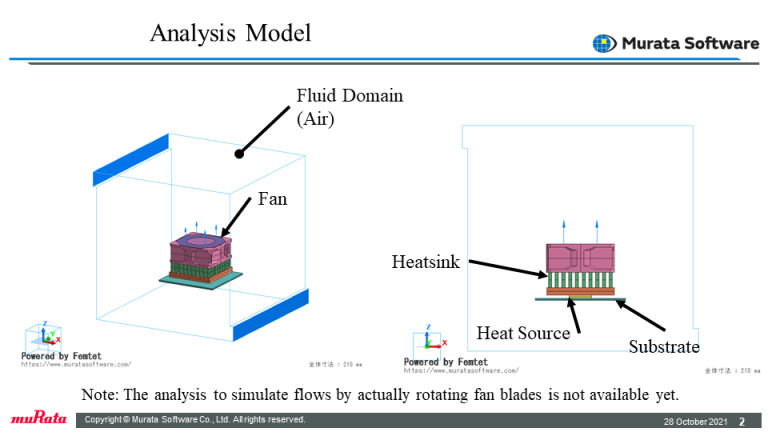 Flow condition inside the fluid domain can be set. Active heatsink and forced flow circulating in a closed space are solved. *Fluid-thermal coupled analysis is optional.