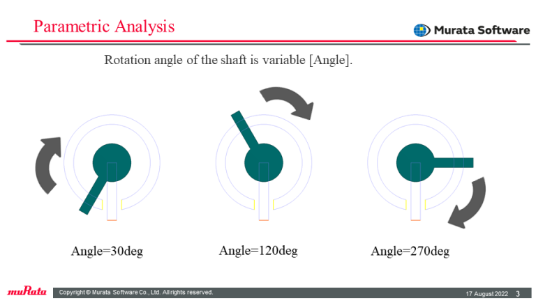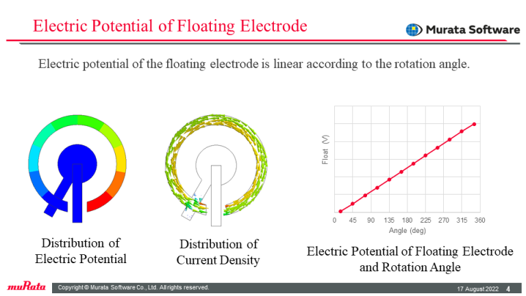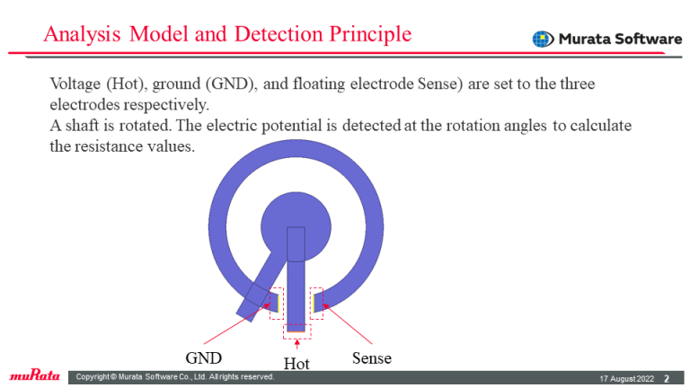 For the three electrodes, a voltage is set for the input, a floating electrode is set for the output, and a 0V potential is set for the GND in boundary conditions, and the floating electrode potential is sensed for the rotation angle of the shaft.