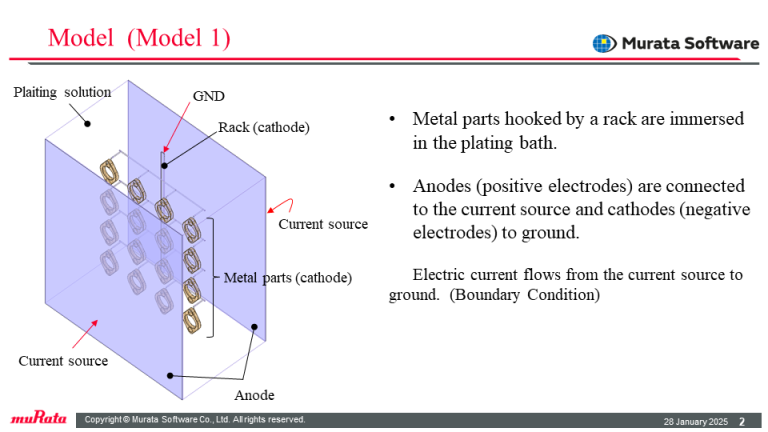 Anodes (positive electrodes) are connected to the current source and cathodes (negative electrodes) to ground. It is assumed that the rack is coated with an insulator, except for the hook portions that are in contact with the metal parts. To achieve this assumption, a volume of plating solution corresponding to the coated area is removed from the plating solution, creating a void. Since electric current cannot flow through the void, insulation can be achieved.