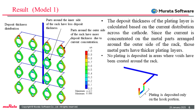 The deposit thickness of the plating layer is calculated based on the current distribution across the cathode. Since the current is concentrated on the metal parts on the outer side, those metal parts have thicker plating layers. On the surface of the rack, except for the hook portions, voids are provided around to achieve insulation, and no plaiting is deposited.