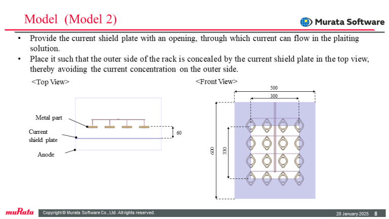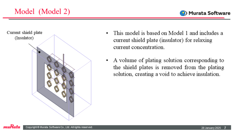 This model is based on Model 1 and includes a current shield plate (insulator). A volume of a plating solution corresponding to the shield plates is removed from the plating solution, creating a void to achieve insulation.