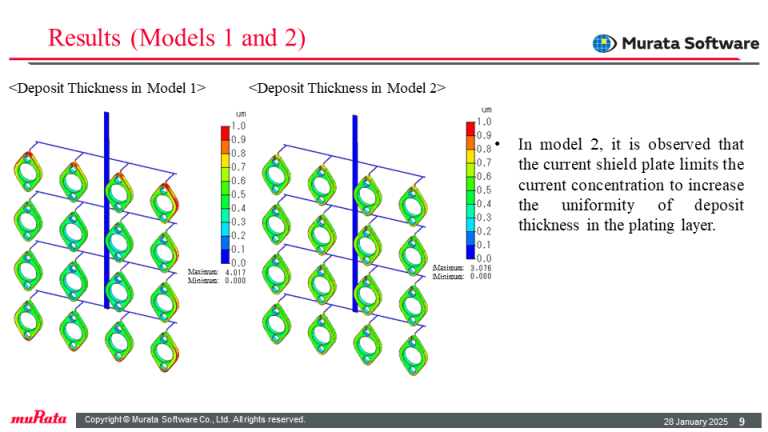 It is observed that the current shield plate limits current concentration to increase the uniformity of deposit thickness in the plating layer.