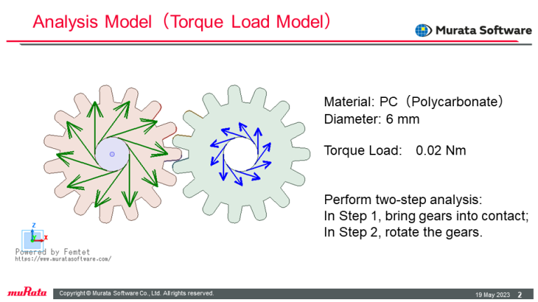 The example shows contact analysis of gears rotating under constant torque.