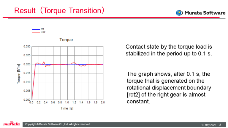 The analysis shows that the contact portions move as the gears rotate, and the torque transmitted to the right gear is almost constant.