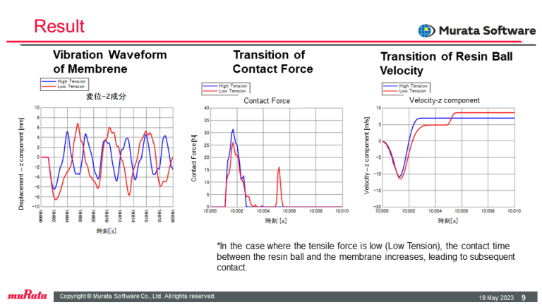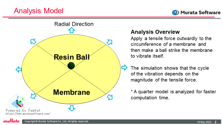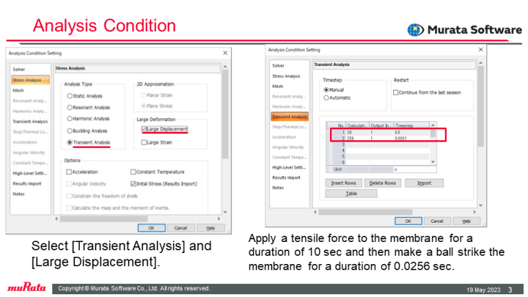 In the stress-transient analysis, gradually apply a tensile force to a drumhead, followed by applying a load to a ball, and make the ball strike the drumhead.