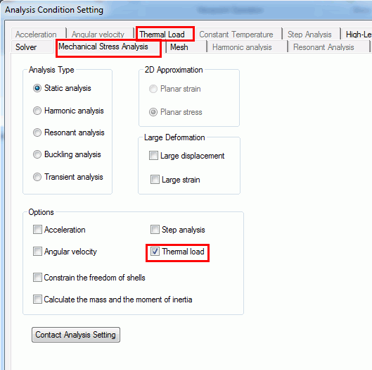 Set up the analysis conditions for the stress analysis as follows.