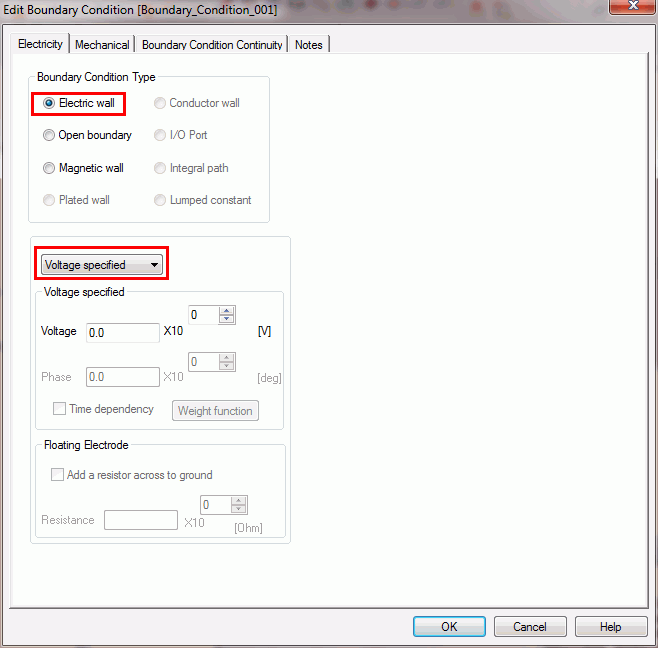 Boundary Condition : Electric Wall (Electric Potential Specified), 0V(body1), 1V(body2)