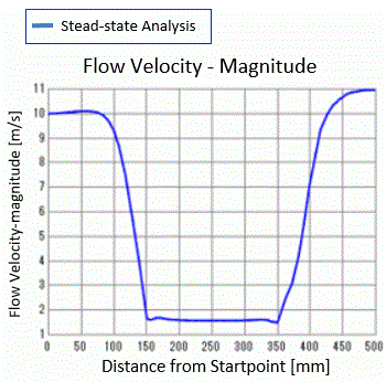 The averaged flow velocity is displayed for the inside of the porous part. (The velocity in the porous part is at its highest value according to the porosity)