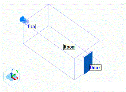 The air domain is shown as below. The model represents a room with a ventilator and a door. The door is assumed to be opened.