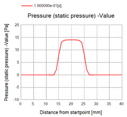 The contour of the static pressure at 0.1 [s] and the graph of the static pressure distribution that has the x range of -20 to 20 and the z fixed at 0 are shown below.