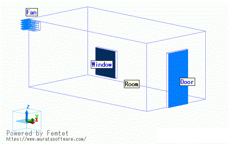 The air domain is shown as below. The model represents a room with a ventilator, a door, and a window. The door and the window are assumed to be opened.
