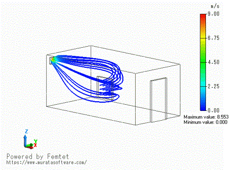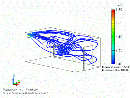 The streamlines of the flow coming from the window at 180 [s] is shown below.