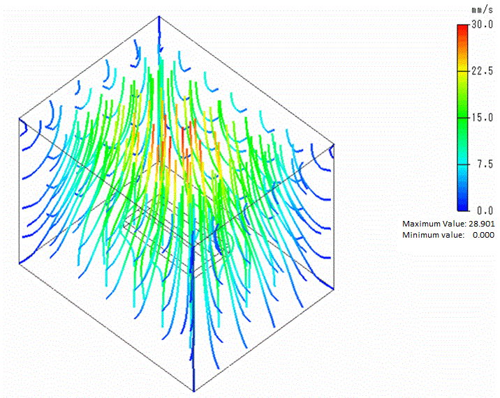 By switching the solver type from the thermal to fluid analysis, the flow velocity streamlines are shown as below.