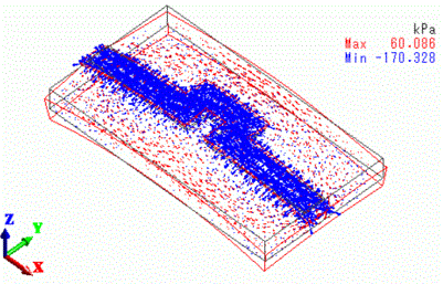 The deformation as a result of stress analysis is shown below. The vectors represent the stresses. The unit is [Pa].