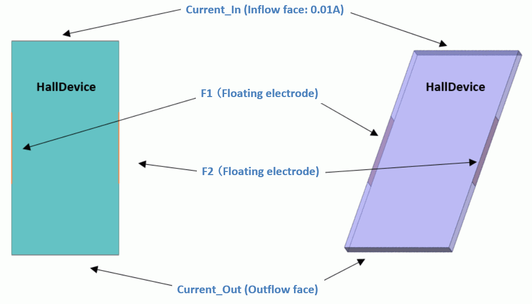 In a 3D model, a sheet body represents the Hall device. The electrodes to apply the current and floating electrodes to monitor the Hall voltage are set on the circumferential edges.