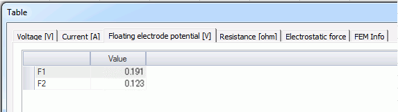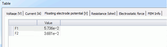 Set applied current to Current_In. Current_Out is an outflow face of current. F1 and F2 are floating electrodes.