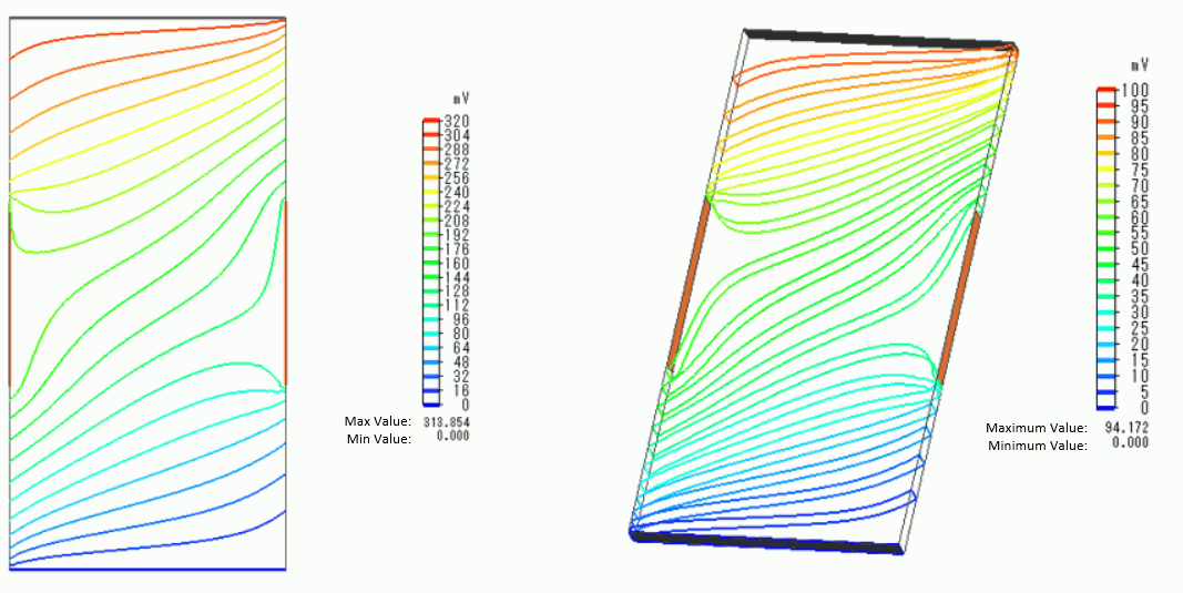 You can see that the distributions of electric potential and current are disturbed due to the Hall effect.