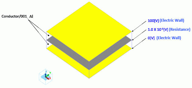 The electric wall boundary condition is set on the bottom face and the top face. The electric resistance is set as a boundary condition on the boundary face of the two bodies.