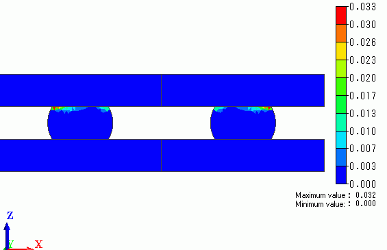 The following diagram shows distribution of equivalent inelastic strain amplitudes. To make this diagram show up, it is necessary to change of the solver type from [Stress Analysis] to [Fatigue Life Assessment].