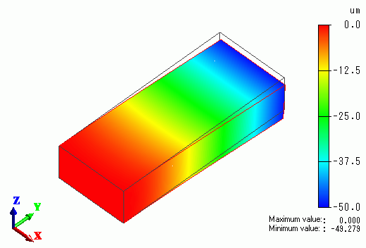 The displacement is bigger towards the tip of the bar. At the tip of the bar, the Z displacement is about 49 um.