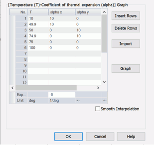 The temperature dependency of the coefficient of linear thermal expansion is set as follows. The direction of the body attribute is by default. Components (x, y, z) of the coefficient of linear thermal expansion correspond to the coordinates (X, Y, Z) of the modeling window.
