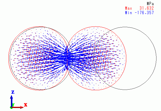 The principal stress distribution at 1.5e-4 [s] is shown on the displacement diagram below.