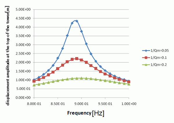 The relation between the maximum displacement at the top of the tower and the oscillation frequency is shown in the following graph.