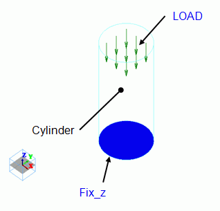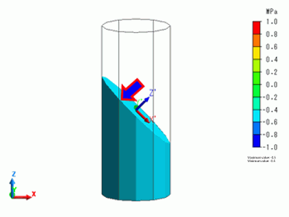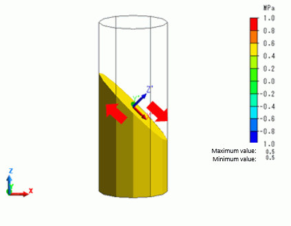 A cylinder is compressed by constant stress. The stress is displayed in the direction specified in the Set Coordinate System.