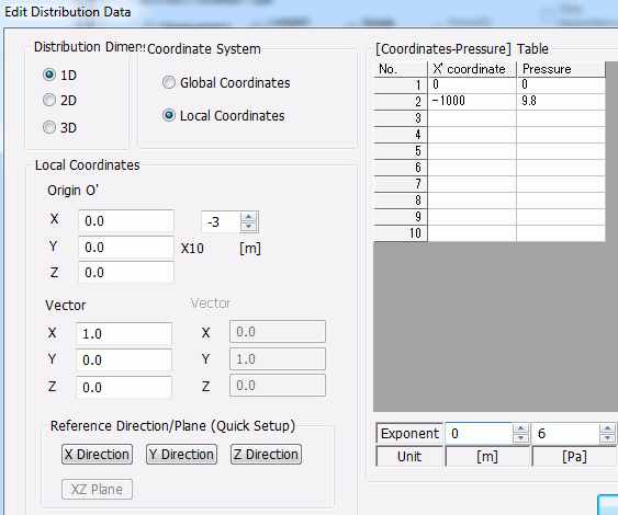 In the [Edit Distribution Data] dialog box, select 1D and set Z direction in the Local Coordinates. In the [Coordinates-Pressure],