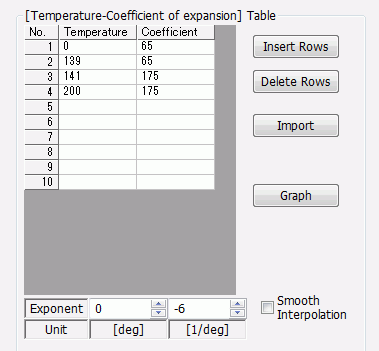 Temperature Dependency: Yes Material Type: Viscoelasticity Setting by: Table Poisson's Ratio: 0.3 Glass Transition Temperature (Tg): 140 [deg] Enter the storage modulus measured at 1Hz, which is in the csv file below, into the table. |