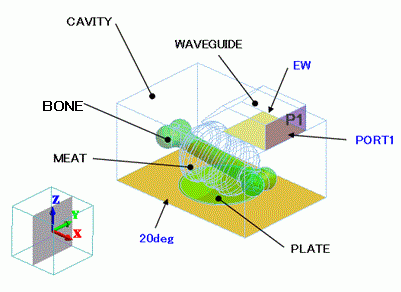 The heating of a piece of meat on the bone placed in a microwave oven is simulated.
