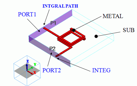 A coil (METAL) of a solid body is created inside a substrate (SUB). The ports (PORT1,PORT2) are set on the substrate faces where coil leads come out. Other substrate faces are set with the outer boundary condition to [Electric Wall].