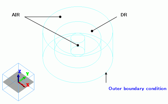 A cylindrical-shaped air solid (AIR) is created. At the center, a cylindrical-shaped dielectric solid (DR) is created.