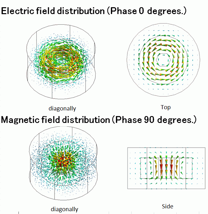 The field distributions for TE01δ mode are shown below. The electric field is at phase 0 deg. The magnetic field is at phase 90 deg.