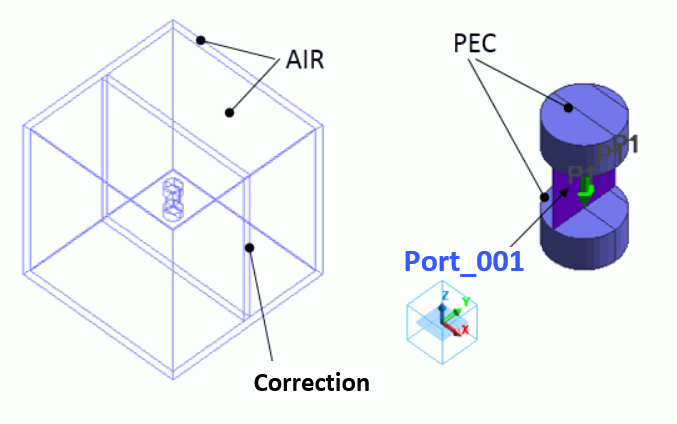 A minute dipole antenna consists of a perfect electric conductor ('PEC') and port, surrounded by ambient air. The 'correction' body serves as a domain for correcting electromagnetic fields, specifically set to minimize calculation time.