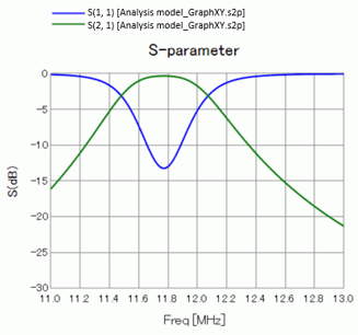At around 12 MHz, S21 is larger than S11, indicating that the power from Port1 is mostly transferred to Port2.