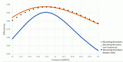 Since the wavelength of the analysis frequency (25m) is much larger than the size of self-resonant coil (50 square cm), the absorbing boundary used for low frequency analysis is applied as an open boundary type.