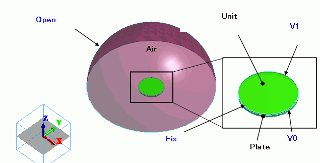 A piezoelectric disc (Unit) is placed on an aluminum disc (Plate). The hemispheric body (Air) covers the upper area.