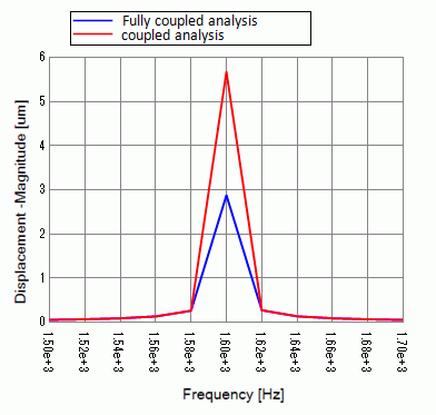 Under the fully coupled condition, the air can suppress the vibration of the disc, so the displacement magnitude is smaller at the resonant frequency of 1.6 [kHz]. When moving away from the resonant frequency, the difference in magnitude becomes very small.