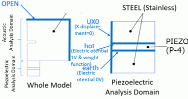The domain for the piezoelectric analysis consists of an piezoelectric material and stainless steel. The electric potential-specified boundary conditions of hot and earth are set to the piezoelectric material. The electric potential 0 [V] is set to “earth” and the voltage oscillating in sine wave is set to “hot”.