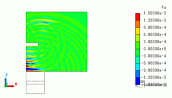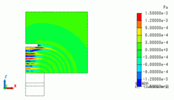 The sound pressure distribution at 300[us] is shown below. As expected, it is confirmed that the reflected waves return to the piezoelectric material from the obstacle.