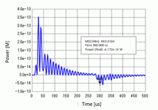 Fig. 4 is a power graph. In the Result Table, set solver to [Acoustic Analysis], set selection mode to [Show all results summary] , and select [Power] tab. Then press Graph button to draw a graph with time on the horizontal axis and power on the vertical axis.
