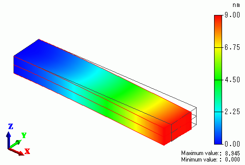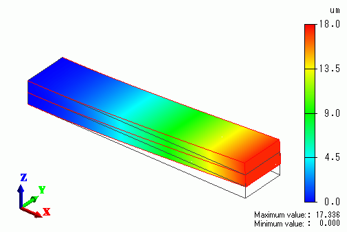 One end is mechanically fixed. The electric potentials of top and bottom faces are 10 [V] and 0 [V], respectively. The same model as the example 1.