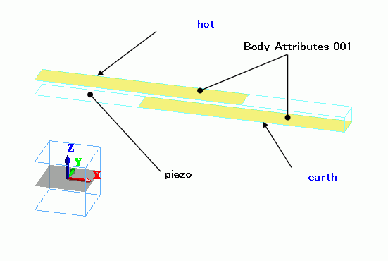 Electrodes (Body Attribute_001) are set on the top and bottom faces of a rectangular piezoelectric rod, with tthe positions shifted.