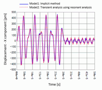 The diagram below is time response at the coordinates (2.5, 0.0, 0.1). The results of models 1 and 2 are plotted on the same graph.