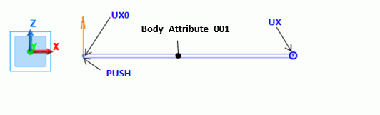 The displacement vector (boundary condition UX) is set to the right end since it is pulled in the right direction. The lumped load boundary condition (PUSH) is set to the tip on the bottom of the left end.