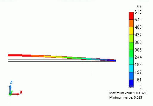 With [Large Displacement] selected, the analysis is nonlinear. The Z deformation is gradually diminished as the tensile force becomes larger.