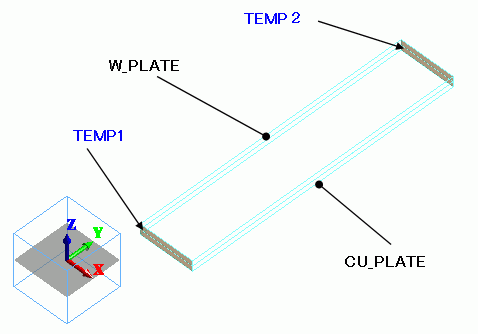 Two rectangular solid bodies are created to form plates. One is of copper and the other is of tungsten.