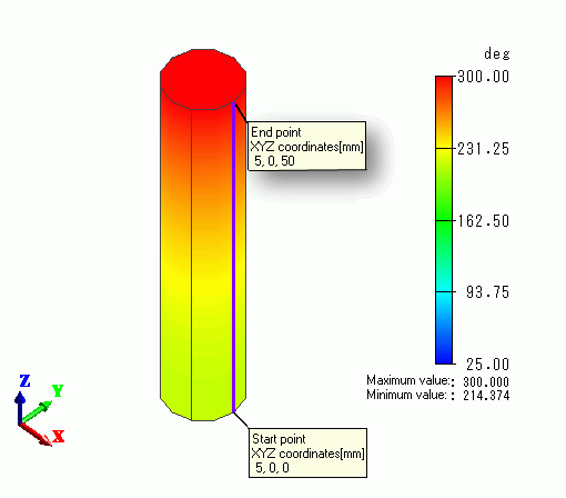 The initial temperature of the cylindrical body is 25[deg]. The top face is set to 300[deg] with the temperature boundary condition.