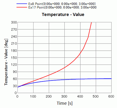 However, the temperature increases more than in example 8 at 300 and 450 sec as the heat increases with higher temperatures.